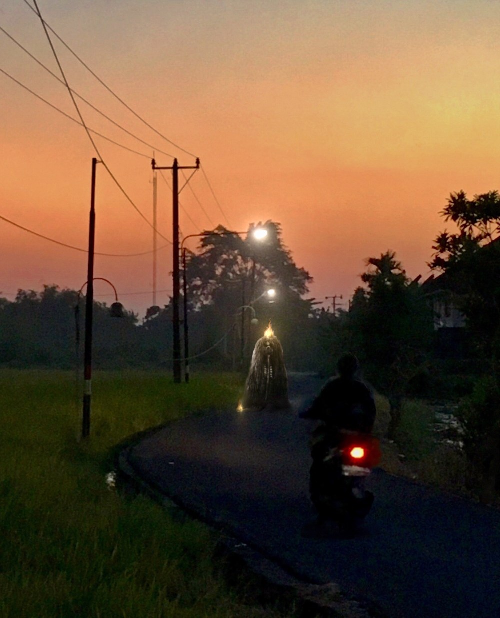Ketika berbelok di tikungan, ia mendengar suara musik tarian Barong Bangkung di kejauhan, dan sekitar dua ratus meter jauhnyan tampak siluet iringan barong dengan musik sayup-sayup. Barong Bangkung yang berwujud babi hutan biasa diarak keliling desa, ditemani beberapa anak remaja dengan gamelan musik bambu sederhana, ini dilakukan terutama berdekatan pada hari raya Galungan dan Kuningan. Semara melajukan motornya perlahan sambi memerhatikan dengan memicingkan mata. Iringan itu menghilang timbul di kejauhan karena lampu-lampu jalan, namun jelas semakin dekat ke arahnya. Akhirnya Semara menghentikan sepeda motor di tepi jalan karena merasakan sesuatu yang janggal. Satu mobil melaju cepat melewatinya, membuat ia terhentak kaget.